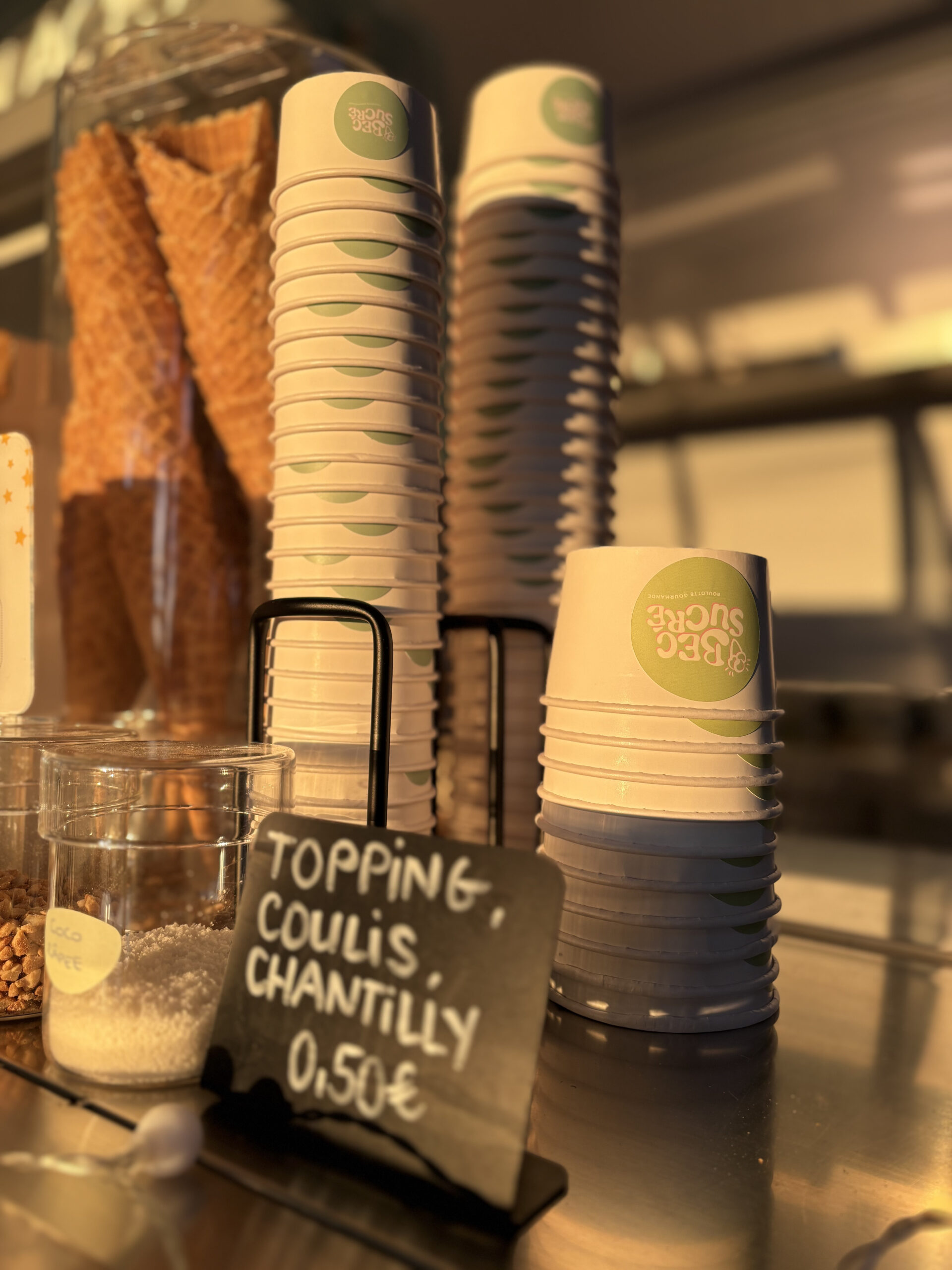 Et pour sublimer votre cornet ou votre pot, nous proposons des toppings : chantilly, éclats de noisettes grillées ou coulis de fruits rouges… De quoi personnaliser votre glace selon votre gourmandise !
